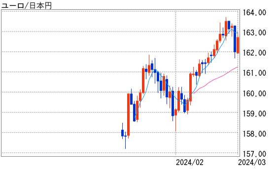 ユーロ円は対ドルでのユーロ高や、堅調なドル円を支えに26日に1ユーロ=163円72銭を付けた。その後はやや上値が重くなり163円00銭を挟んでの推移となった後、高田日銀審議委員発言を受けた円買いに161円69銭までユーロ安円高となった。ドル円の反発や日経平均の大幅高などを支えに1日に163円台を一時回復している。