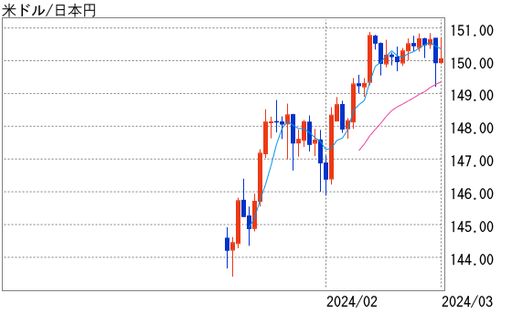 23日に150円77銭を付けた流れが継続し、週明け26日もドル高が優勢となった。東京市場では米債利回りの低下もあり150円29銭を付けたが、その後米債利回りが反転上昇しドル高が強まり、150円84銭を付けた。