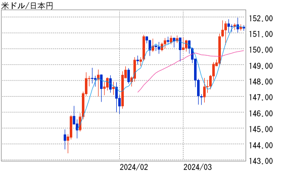 3月の日銀金融政策決定会合でマイナス金利の解除、YCC廃止など、従来の大規模緩和の修正を決定。市場予想通り政策金利の据え置きを決めた米連邦公開市場委員会(FOMC)では、2024年中3回の利下げ見通しが維持された。しかし、日銀の当面の緩和姿勢継続が見込まれること、米国の6月利下げ開始見通しがやや後退していることなどを背景に、日米金利差を狙ったドル円の買いが続いた。
