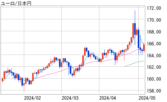 ドル円が158円近くまで上昇する中で168円60銭台まで上昇。その後の介入と見られる円買いに164円09銭を付けた。ドル円の戻りに合わせて167円台まで上昇も、2日から3日にかけての円買いに164円02銭と安値を更新したが、164円00銭台を維持したこともあり、週明けユーロ買い円売りとなった。