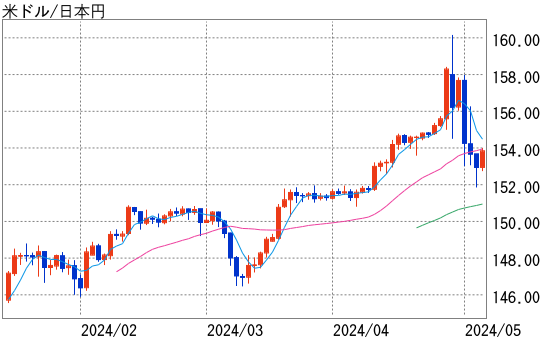 25日、26日の日銀金融政策決定会合で利上げに向けた姿勢が見られず、円安対応についても強い言及がなかったことや、29日が昭和の日で日本市場が休場となることで、介入の可能性がやや低いのではとの思惑もあって、26日海外市場から一気に強まったドル高円安が、29日からの週に入っても継続。26日の市場で上値を抑えた1ドル=158円50銭前後を超えると、ストップロス注文などを巻き込んで動きが加速。1990年以来の160円台に乗せ、160円17銭を付けた。160円台の買いにはさすがに少し慎重になり、159円台での推移となった後、同日日本時間午後に入ってドル安円高が一気に進んだ。財務省によるドル売り介入ではないかと思われる動きとなったが、神田財務官(用語説明1及び2)など当局者は介入であるかどうかの明言を避けた。