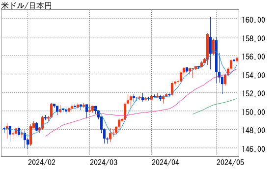 日本当局によるドル売り円買い介入とみられる動きや、3日発表された4月の米雇用統計の予想外の弱さを受けたドル売りなどから、3日に1ドル=151円86銭を付けた。6日以降はドル買い円売りが優勢となり、9日には156円に迫った。