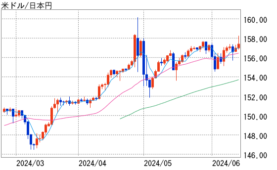 12日の米CPIを受けてドル売りが一気に強まると、155円70銭台を付けた。しかし、同日の米連邦公開市場委員会(FOMC)で、四半期に一度示されるFOMCメンバーによる経済見通し(SEP)の中のドットプロット(用語説明1)で年1回の利下げが見通しの中央値となったことで、ドル買いとなり、同日のうちに156円90銭前後まで上昇。13日には米CPI前の水準まで買い戻された。