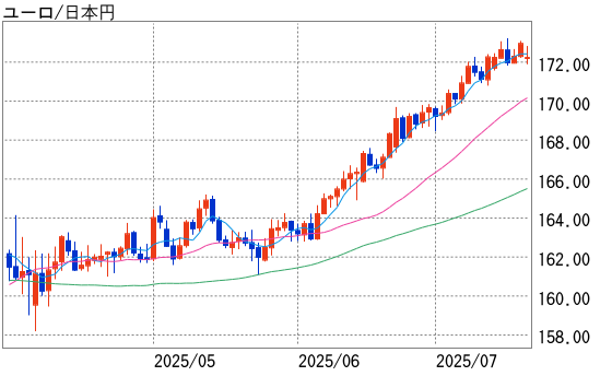 ユーロ円は1ユーロ=172円台を中心とした推移。ドル円の上昇を受けて173円台を付ける局面が見られたが、対ドルでのユーロ売りもあり、上値が抑えられた。