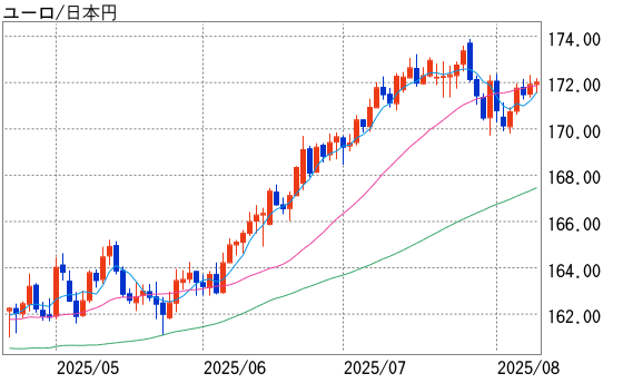ユーロ円はドル主導の中でやや不安定な動き。先週前半はドル円の下げもあってユーロ安円高が優勢となり、5日に169円82銭を付けた。その後は対ドルでのユーロ買いなどを支えとして上昇。8日に172円34銭を付けている。