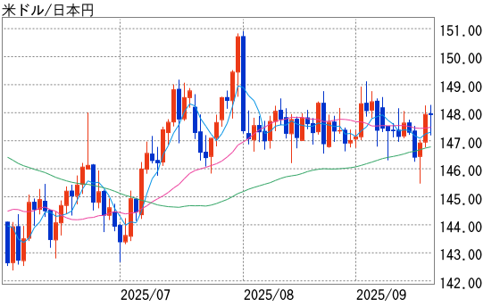 週明けの1ドル=147円80銭前後から146円20銭台まで下げて17日(日本時間18日午前3時)のFOMC結果発表を迎えた。FOMCでは市場予想通り0.25%の利下げを決定。参加メンバーによる経済見通し(SEP)の中で示される年末時点での各メンバーの政策金利水準見通しをドットで示したドットプロットでは10月、12月の連続利下げを意味する3.50-3.75%が中央値となった。