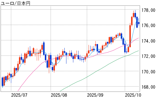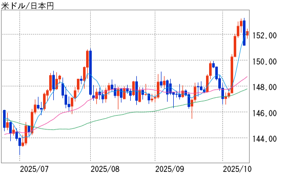 その後も高市新総裁の積極財政期待からのドル高円安が継続し、8日には153円00銭前後まで上値を伸ばした。ユーロ円がユーロ発足後の最高値を更新する177円80銭台を付けるなど、クロス円でも軒並みの円安進行となった。