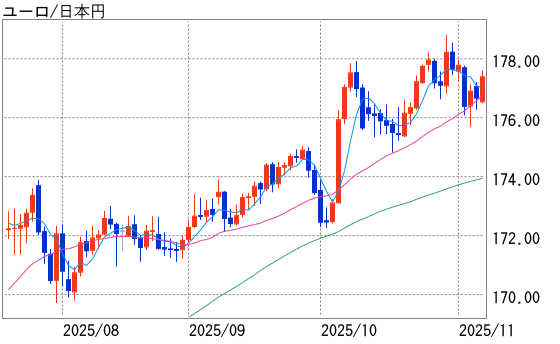 ユーロ円は4日の片山財務相の円安けん制発言などもあって週前半はユーロ安円高となった。株安を受けたリスク警戒の円買いも出ていた。30日に付けた1ユーロ=178円85銭からの下げが続く形で、5日東京午前に175円71銭を付けている。その後は米ISM非製造業景気指数の好結果を受けたリスク選好の円売りなどに反発。週末にかけてのドル円の安値からの上昇もあって、7日に177円61銭を付けている。