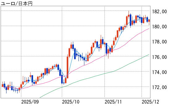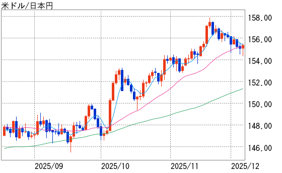 1日はドルがやや下げて始まると、植田日銀総裁が名古屋での金融懇談会で「12月の日銀会合で利上げを議論する」と発言したことを受けて円買いが強まった。ドルは156円20銭前後から155円40銭前後まで急落し、時間外取引の米株先物の軟調もリスク警戒の円買いにつながった。海外市場でもドル安・円高は続き、心理的節目である155円00銭を割り込むとストップロス注文を巻き込んでドル売りが加速し、154円65銭を付けた。ユーロ円が東京朝の1ユーロ=181円29銭から180円14銭、ポンド円が206円91銭から205円21銭など、他通貨対比でも円高が進展した。ドル安・円高もあり、1ユーロ=1.1590ドル前後から1.1652ドルまでユーロ高・ドル安となる場面があった。もっとも、ドル安は長続きせず、同日海外市場で1ドル=155円50銭台を回復し、1ユーロ=1.1600ドル前後を付けた。